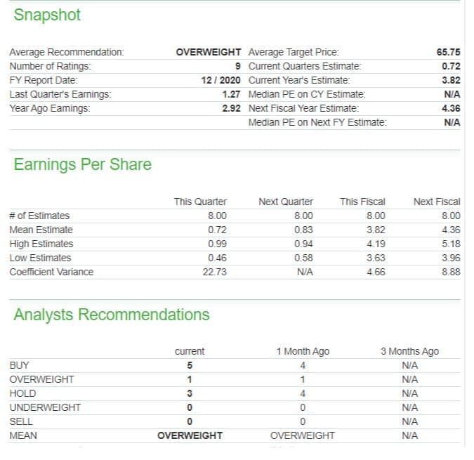- Analysts +1 I read analyst reports but come to your own conclusions. If the consensus is favorable, 1; if unfavorable -1, and mixed 0. If it is overwhelmingly favorable or negative, take the contrarian view. This stock is a “Buy” as per analysts ratings on Marketwatch.com and Yahoo Finance. So the stock scores a +1 for favorable analysts rating. According to The Fly on the Wall– Goldman Sachs analyst Adam Samuelson upgraded Bunge to Buy from Neutral with a price target of $67, up from $64. The stock has been a notable underperformer year-to-date, only rising 1% versus the S&P 500 index’s gain of 26%, Samuelson tells investors in a research note. However, he sees Bunge as a “unique self-help story” within Agriculture that can gain “increasing appeal” in 2020 as elements of its turnaround become clearer. The analyst believes management will provide incremental disclosure on its plans to achieve a 9%-plus return on invested capital. Further, an improving cyclical backdrop “presents optionality”.