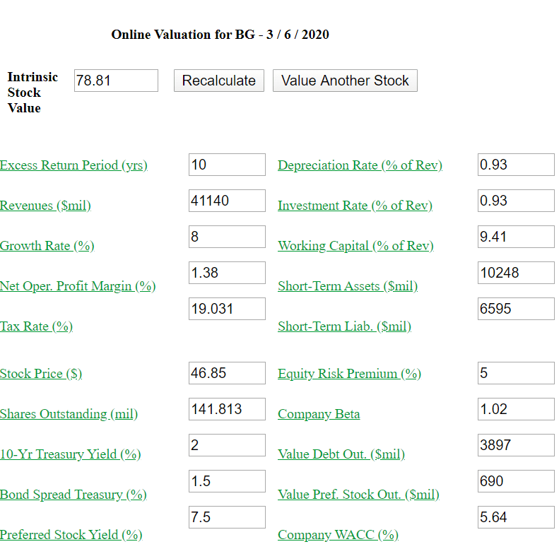 The current stock price is $43.48 on 3/9/20 The best estimate of intrinsic value is $78.81. The stock scores +1 as it is undervalued.