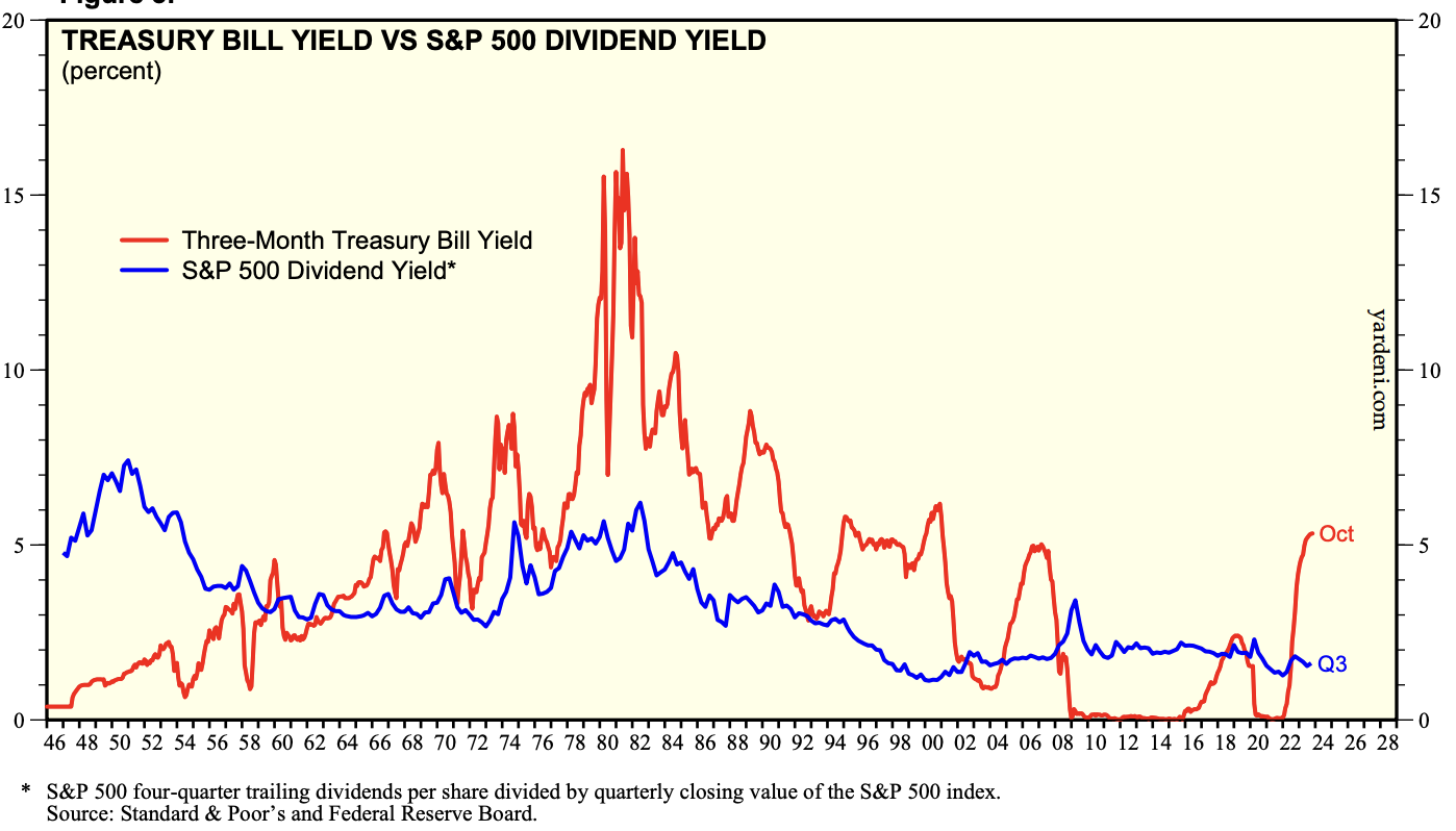 The difference between the 10-year Treasury Bond yield and the S&P 500 dividend yield is the largest it’s been since 2007.  The spread between interest earned on Treasury Bills and dividends reached levels not seen in 40 years. ~5% money market rates and an S&P 500 dividend yield of 1.52% cannot coexist indefinitely. This is not a condition for equilibrium. Something must give. Great amounts of money will be made in getting this right. In the immortal words of Dylan, the poet laureate, “Something is happening here; But you don’t know what it is.” The market changed its narrative last week from higher for longer … Read more