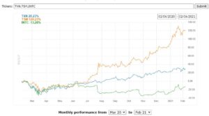 Director Craighead purchased 5975 shares of TXN at $166.91spending just under $1 million. TXN reported blowout earning on January 27th, yet itonically it was one of the poorest performers for the week. Several firms upgraded their price targets. I have to give this the BUY of the Week. There’s been incessant talk about the chip shortage and how the automobile industry is playing second fiddle to the consumer electronics industry, dominated by the likes of Apple and Samsung. Taiwan Semiconductor apparently is making the chips for everyone including the in-house designed Apple chips. Ironically people are convinced that America’s own homegrown chip giant, Intel is in terminal decline.