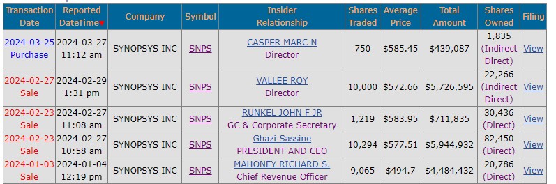 Opinion: Unusual to see insider buying in this group, but it’s something we note even if the simultaneous selling dwarf’s the buying because Synopsis is one of the key foundational parties that makes today’s advanced GPU’s possible. It’s critical to the coming wave of AI that changes everything.