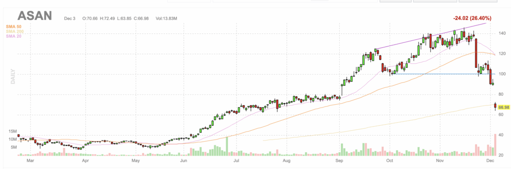Opinion: Asana joined the list last Friday of companies that eviscerated its newest shareholders plunging nearly 27% on Friday. The stock has lost more than half of its value in less than a month. With that decline, Asana now has a market capitalization of $12.3 billion. That is still 27 times the company’s own forecast for revenue in the current fiscal year. What’s really curious with this one is not that it lost so much of its value on a beat and raise quarter, but that it did this in spite of its founder buying tens of millions of dollars of the Company’s stock. We’ve blogged about this one before and are even more dazed and confused. Why is he buying the stock in the first place? He sold stock in the Company when it went public just a year ago in the $30s.