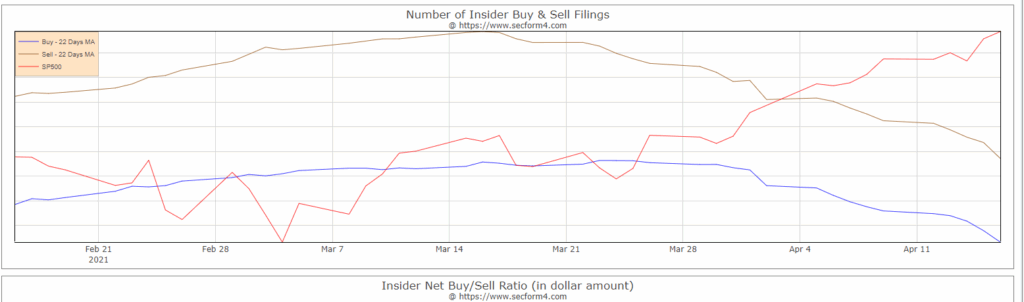 Blueline 5 days moving average of the ratio of buying to selling. It is plummeting. Brown line is 22-day ratio. Redline is the S&P 500. The market goes steadily higher without insiders buying into it.