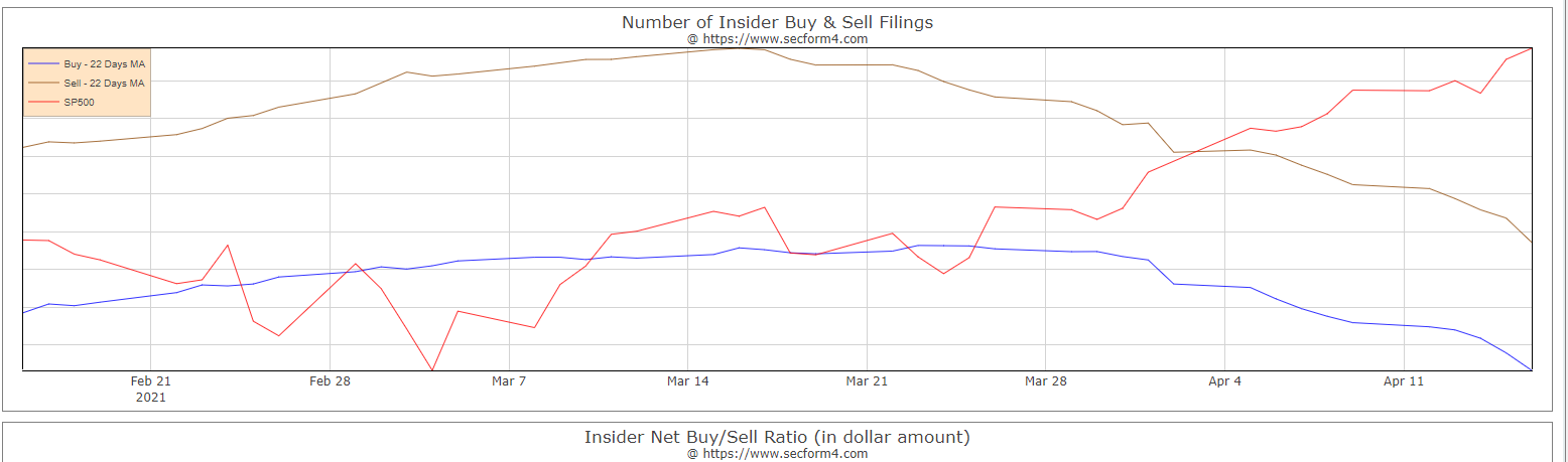 Blueline 5 days moving average of the ratio of buying to selling. It is plummeting. Brown line is 22-day ratio. Redline is the S&P 500. The market goes steadily higher without insiders buying into it.