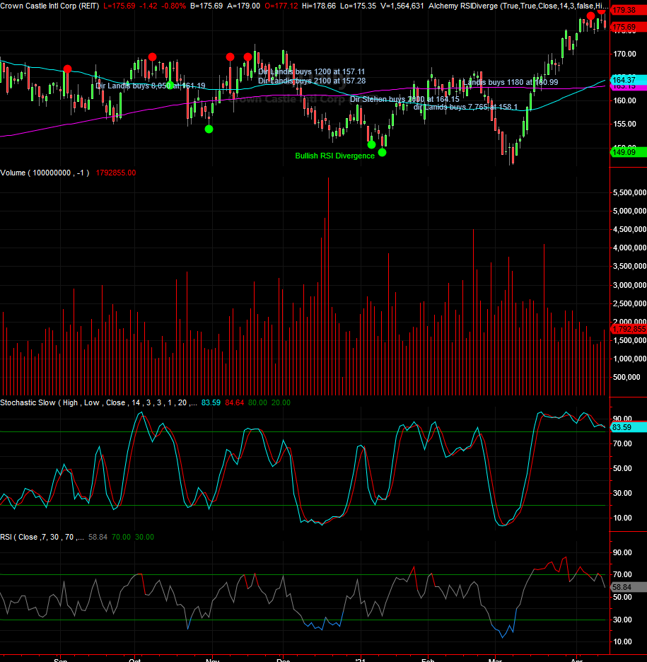 One of the tools I regularly use to preserve gains and especially long-term capital gains is writing covered calls on positions that I think can do down in the near term. Technical analysis is a great tool to predict short-term price movements. Take the example of Crown Castle Internationa. Crown Castle is a real estate investment trust and provider of shared communications infrastructure in the United States. Its network includes over 40,000 cell towers and nearly 80,000 route miles of fiber supporting small cells and fiber solutions. Wikipedia