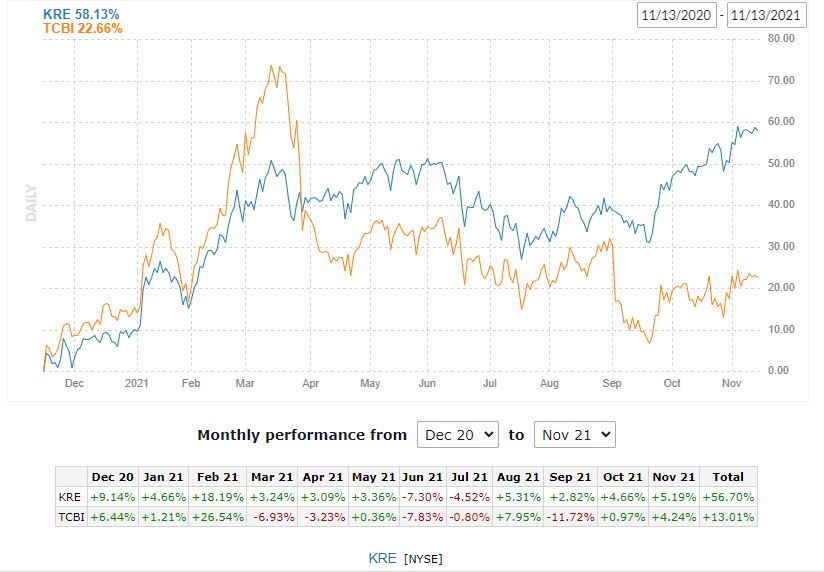 Opinion: Cluster insider buying is a good thing and we bought into this underperforming regional bank. TCBI is underperforming its peers as seen in the chart below. There is no reason to as the Texas economy is one of the best in the nation.
